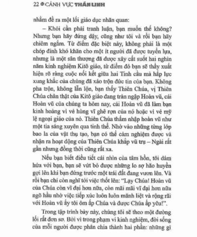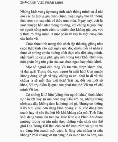“Cảnh Vực Thần Linh” mở ra cho người đọc một cái nhìn sâu xa và mới mẻ về đời sống nội tâm. Qua tư tưởng độc đáo của Teilhard de Chardin, cuốn sách cho thấy rằng con người không chỉ tìm gặp Thiên Chúa trong cầu nguyện hay thinh lặng, mà còn trong chính nhịp sống hằng ngày, trong lao động, đau khổ và niềm vui. Mỗi tương quan, mỗi khoảnh khắc đều có thể trở thành “cảnh vực thần linh” nếu ta biết sống với lòng yêu mến và ý thức.